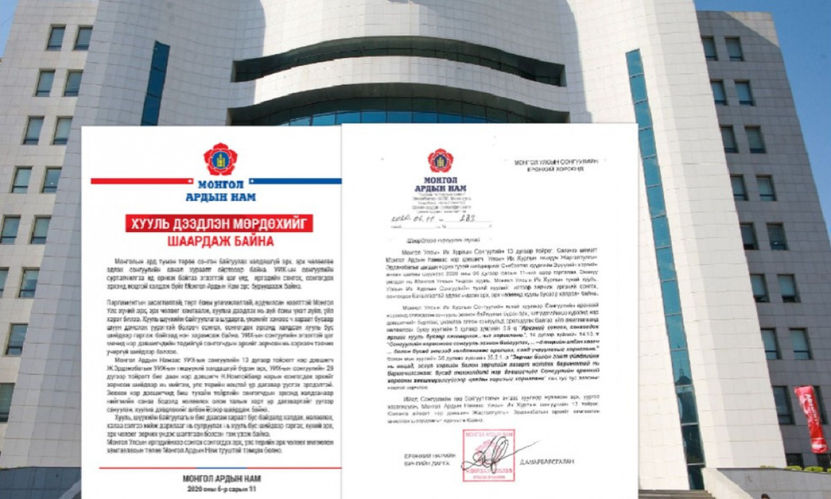 Уг шаардлагад, “Монгол Ардын намаас УИХ-ын сонгуулийн 23 дугаар тойрогт нэр дэвшигч Ж.Эрдэнэбатын УИХ-ын гишүүний халдашгүй бүрэн эрх, УИХ-ын сонгуулийн 29 дүгээр тойрогт бие даан нэр дэвшигч Н.Номтойбаяр нарын сонгогдох эрхийг зөрчсөн шийдвэр нь нийгэм, улстөрийн ноцтой үр дагавар үүсгэх эрсдэлтэй. Зөвхөн нэр дэвшигчид биш тухайн тойргийн сонгогчдын эрхэнд халдсанаар нийгмийн санаа бодолд нөлөөлөх олон талын хорт үрт дагавартайг үүгээр сануулан, хуулиа дээдлэхийг албан ёсоор шаардаж байна” гэв.