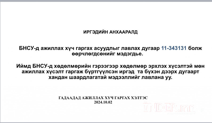 БНСУ-д ажиллах хүч гаргах асуудлыг лавлах дугаар 11-343131 болж өөрчлөгдсөнийг мэдэгдье. Иймд БНС